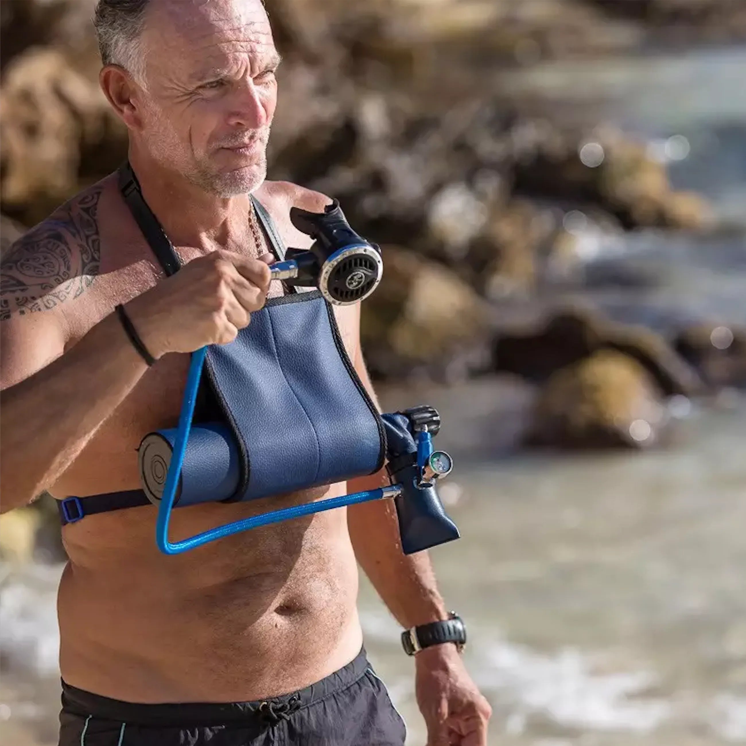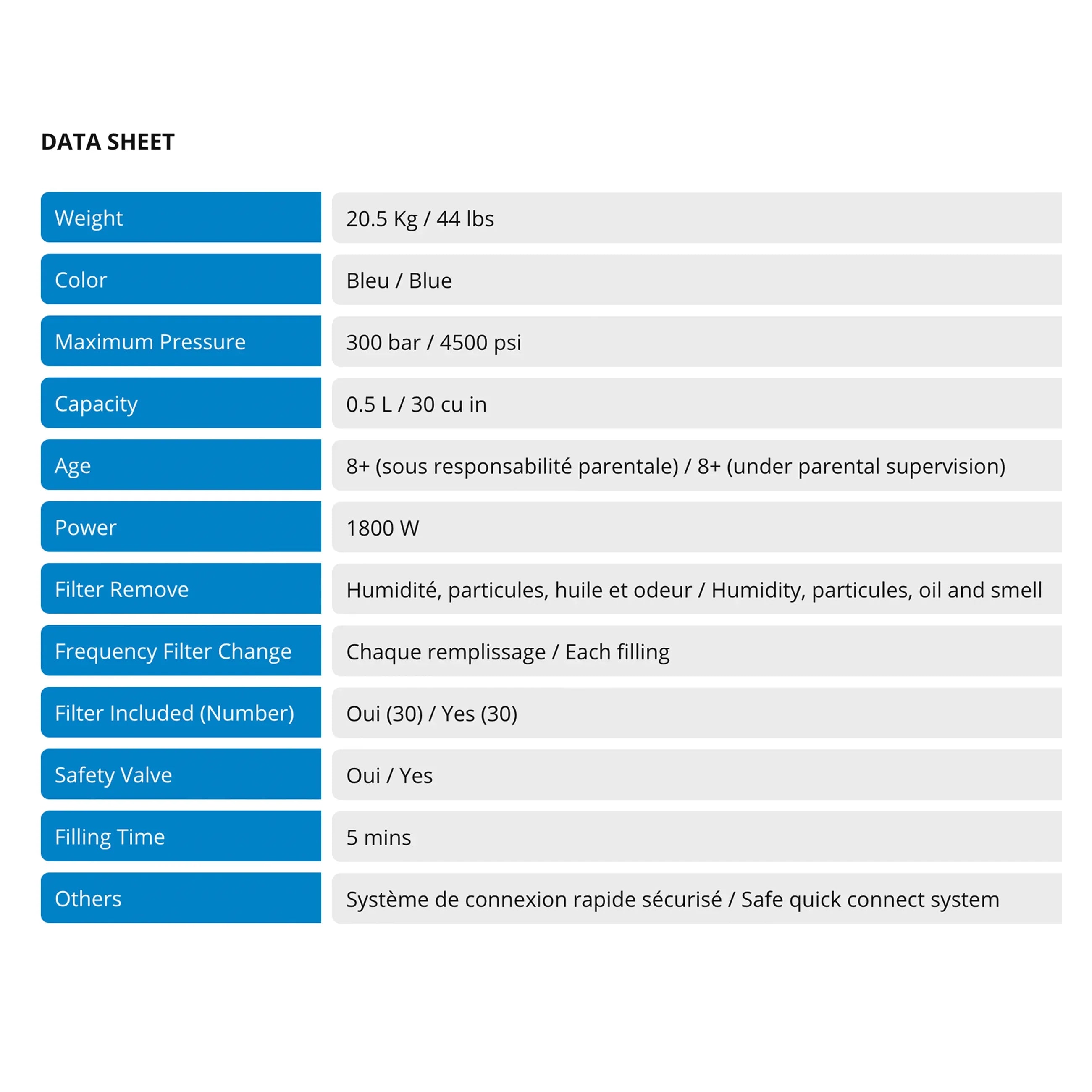 • It includes a 0,5 L cylinder of 300 bar with the regulator system. Very easy to use, you just have to take the regulator in your mouth and breathe!
