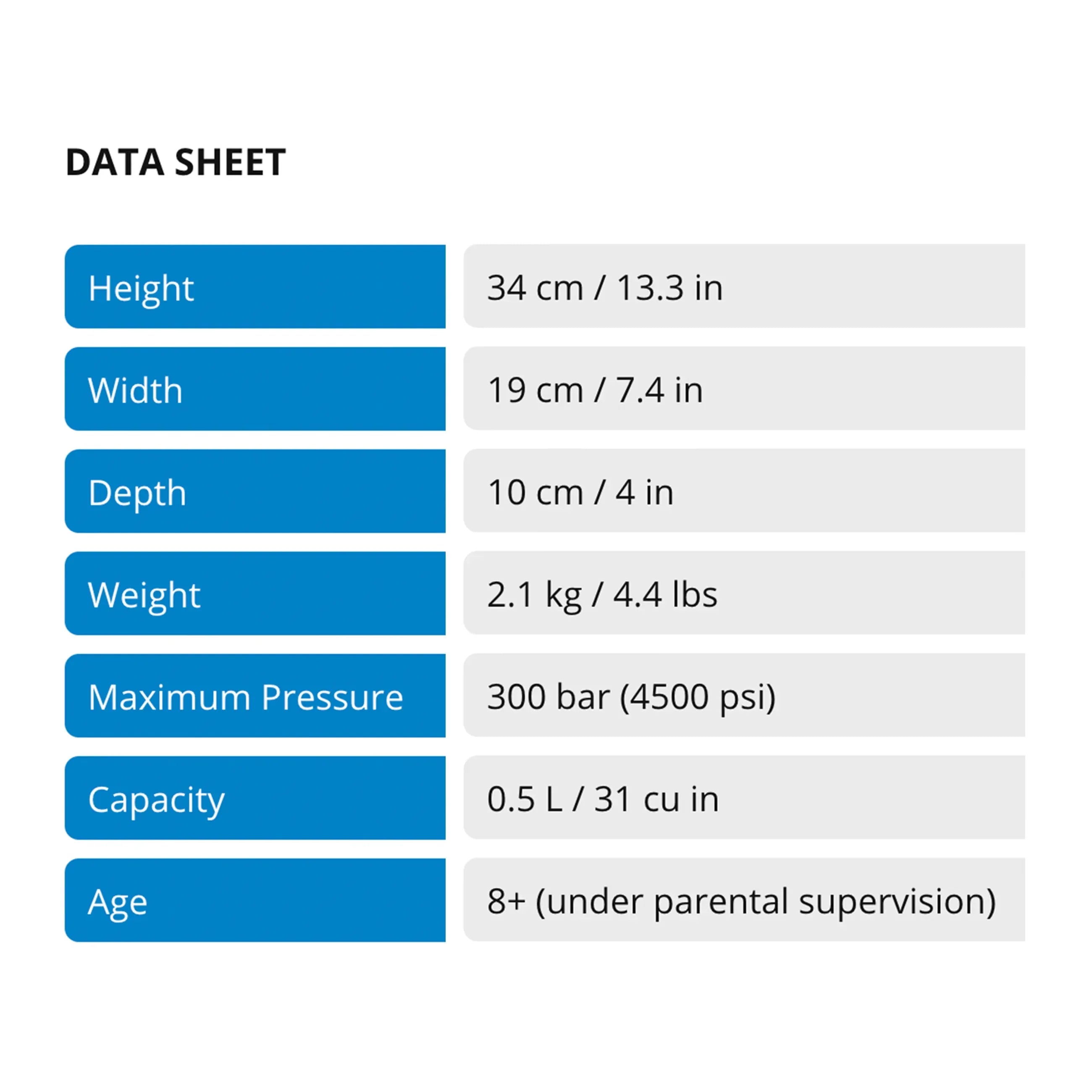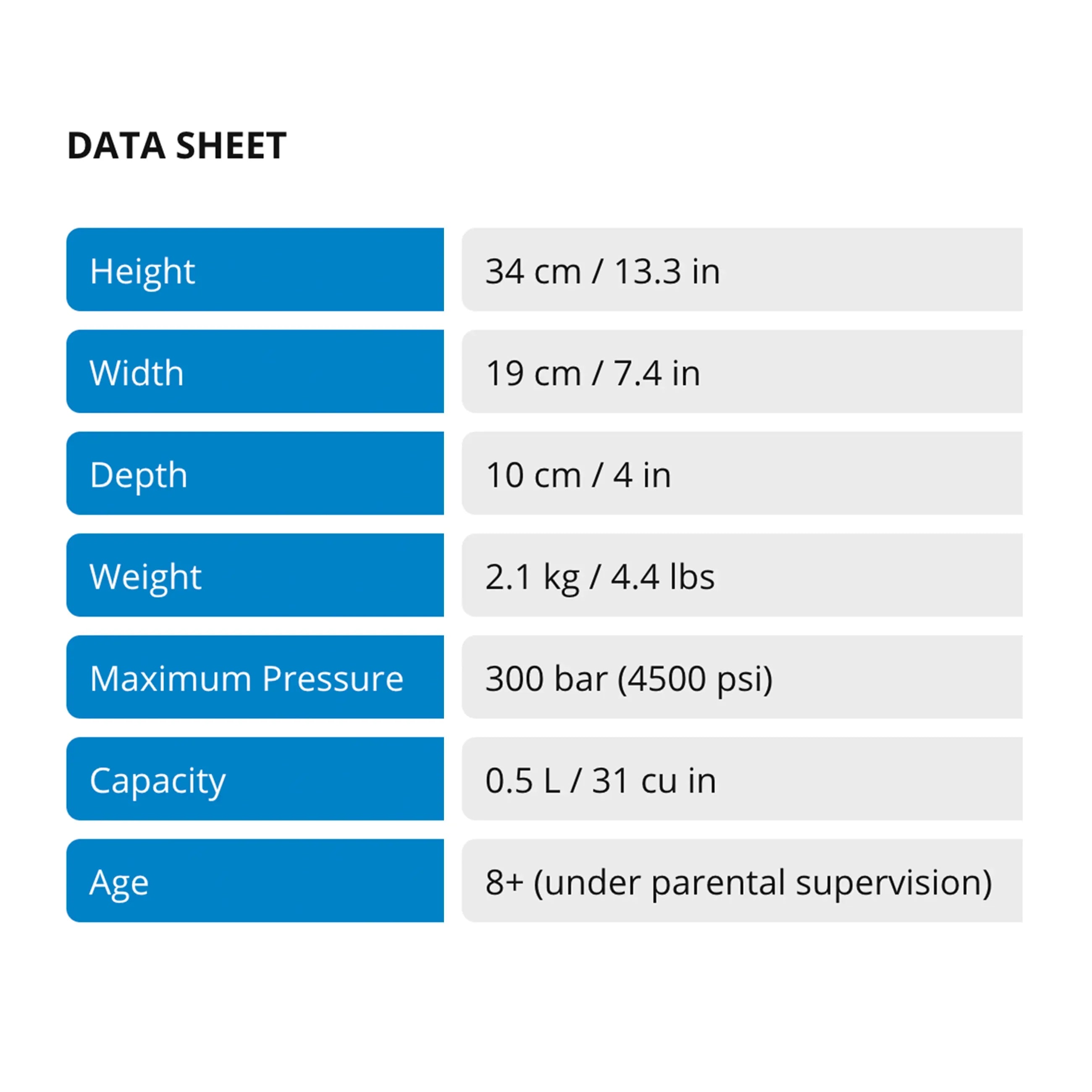 • Capacity: 0,5 L / 30 cu in