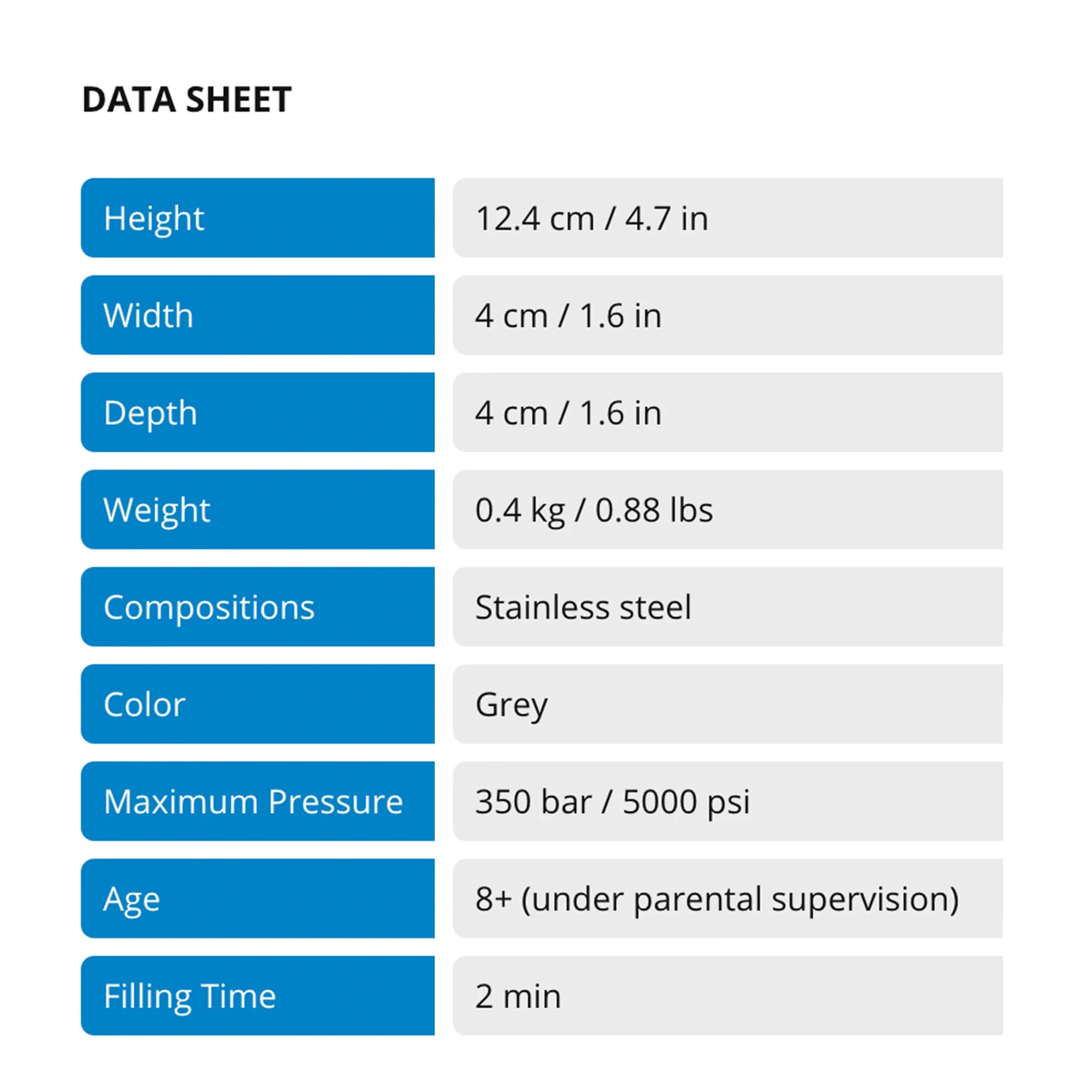 This filling station allows the filling of the Dive Systems MiniDive Evo / Evo+ / Air / Air+ / Pro / Pro+ / Carbon / Carbon+ / Carbon Max directly from a large diving tank and its DIN valve, the connection between the 2 tanks takes only few seconds.